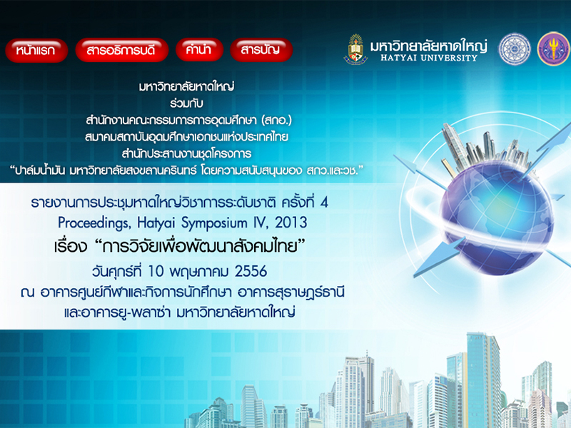 ในนามของมหาวิทยาลัยหาดใหญ่ ขอขอบคุณสำนักงานคณะกรรมการวิจัยแห่งชาติ (วช.) สำนักงานคณะกรรมการการอุดมศึกษา (สกอ.) สมาคมสถาบันอุดมศึกษาเอกชนแห่งประเทศไทย (สสอท) ที่ให้การสนับสนุนกิจกรรมทางวิชาการในครั้งนี้ ขอขอบคุณผู้ทรงคุณวุฒิที่ร่วมกิจกรรมการนำเสนอผลงานวิจัย การประเมินผลงานวิจัย และผู้ร่วมกิจกรรมการประชุมทางวิชาการทุกท่าน ตลอดจนคณะกรรมการดำเนินโครงการที่มีส่วนร่วมในการสนับสนุนให้การประชุมหาดใหญ่วิชาการระดับชาติและนานาชาติ ครั้งที่ 11 ที่ทำให้การดำเนินการประชุมวิชาการครั้งนี้ สำเร็จลุล่วงตามวัตถุประสงค์ที่กำหนดไว้ทุกประการ และหวังเป็นอย่างยิ่งว่าความรู้ที่ได้รับจากการนำเสนอผลงานทางวิชาการครั้งนี้ จะสามารถนำไปสู่การสร้างประโยชน์ให้กับองค์กร ชุมชน และสังคม อันเป็นประโยชน์ต่อการพัฒนาประเทศต่อไป