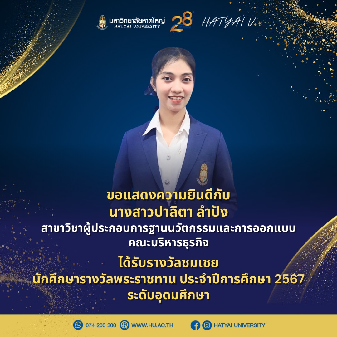 มหาวิทยาลัยหาดใหญ่ ขอแสดงความยินดีกับ นางสาวปาลิตา ลำปัง นักศึกษาสาขาวิชาผู้ประกอบการฐานนวัตกรรมและการออกแบบ คณะบริหารธุรกิจ