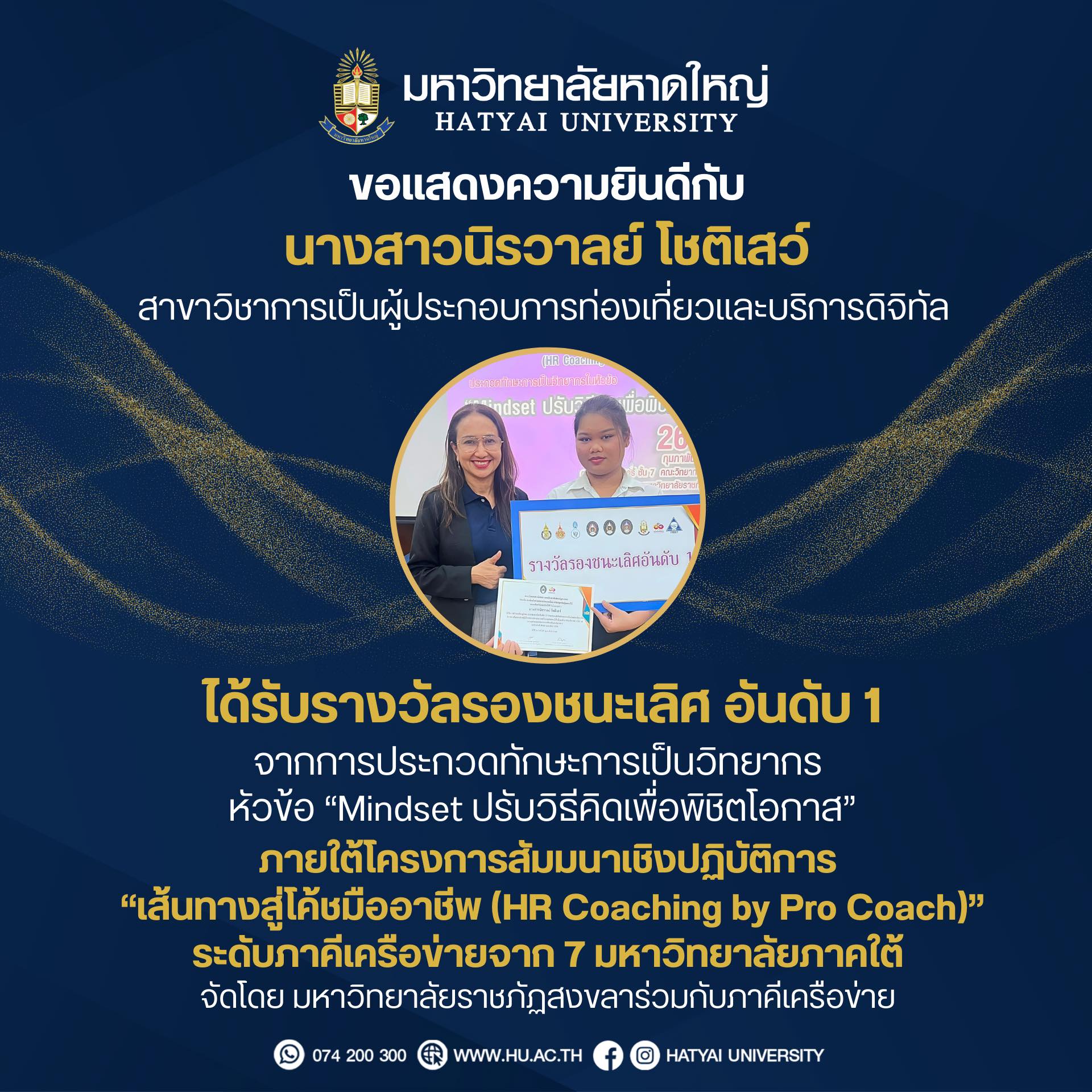 มหาวิทยาลัยหาดใหญ่ขอแสดงความยินดีกับ นางสาวนิรวาลย์ โชติเสว์ นักศึกษาชั้นปีที่ 1 สาขาวิชาการเป็นผู้ประกอบการท่องเที่ยวและบริการดิจิทัล คณะบริหารธุรกิจ