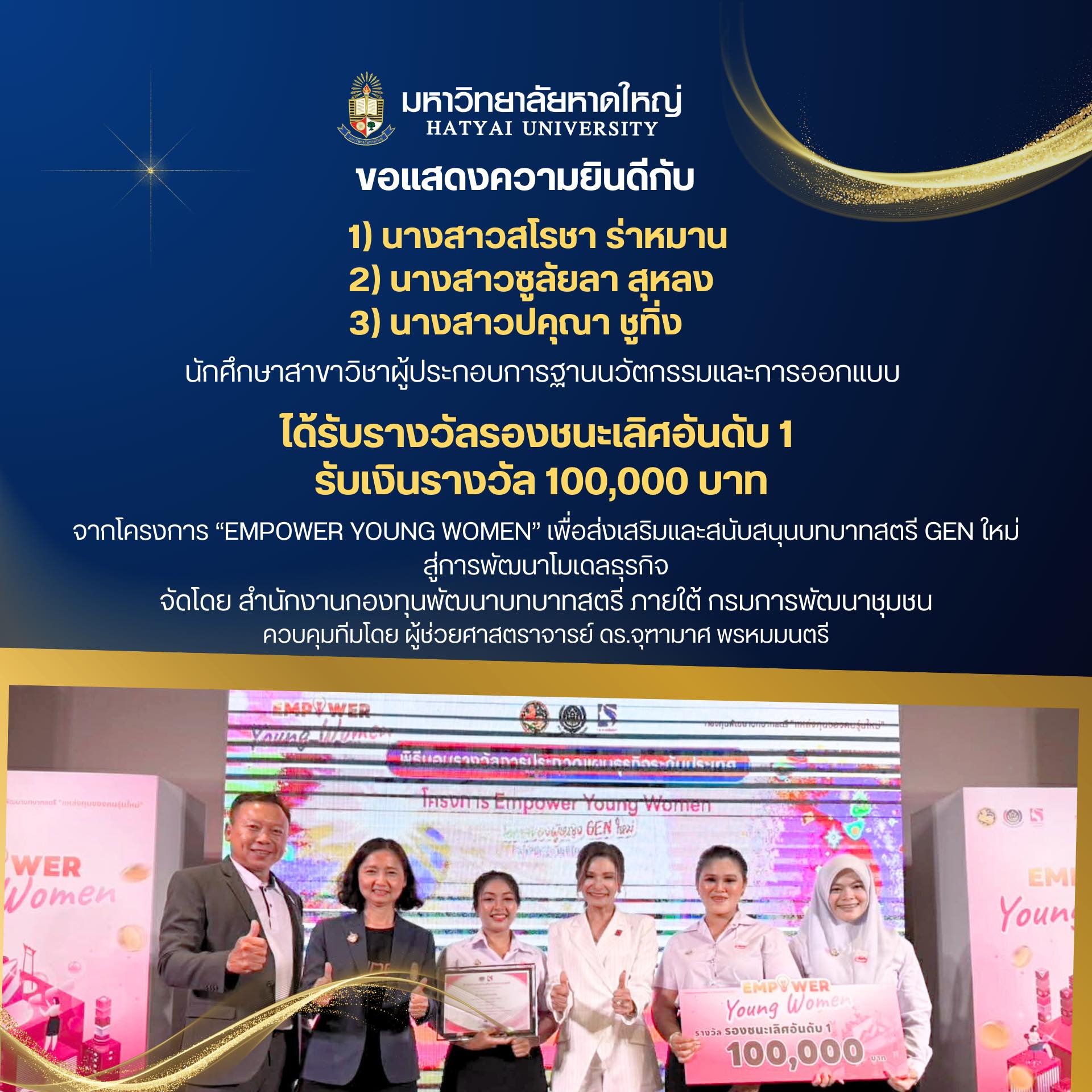 มหาวิทยาลัยหาดใหญ่ขอชื่นชมในความสามารถและความสำเร็จของนักศึกษา ที่สร้างชื่อเสียงและความภาคภูมิใจให้กับคณะและมหาวิทยาลัย