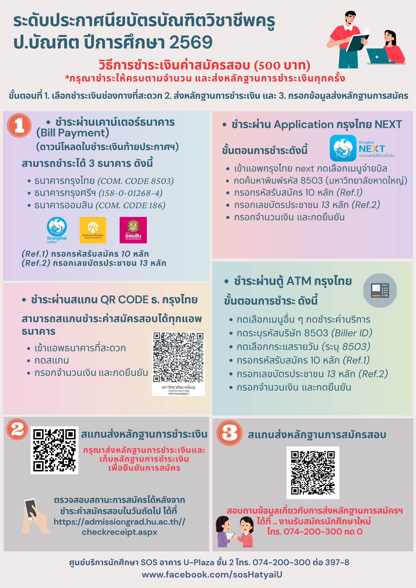 3. รายงานตัวและตรวจสอบหลักฐาน ณ มหาวิทยาลัยหาดใหญ่ : วันที่ 29 มีนาคม 2569
